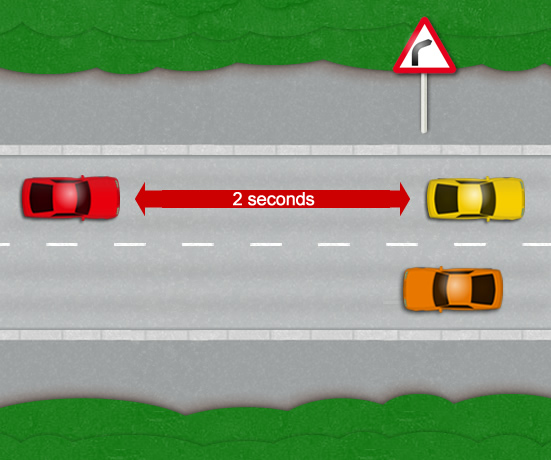 „При сух път и добра видимост, при скоростта, с която се движите, времето за изминаване на разстоянието до движещия се пред Вас автомобил трябва да бъде поне 2 секунди.“